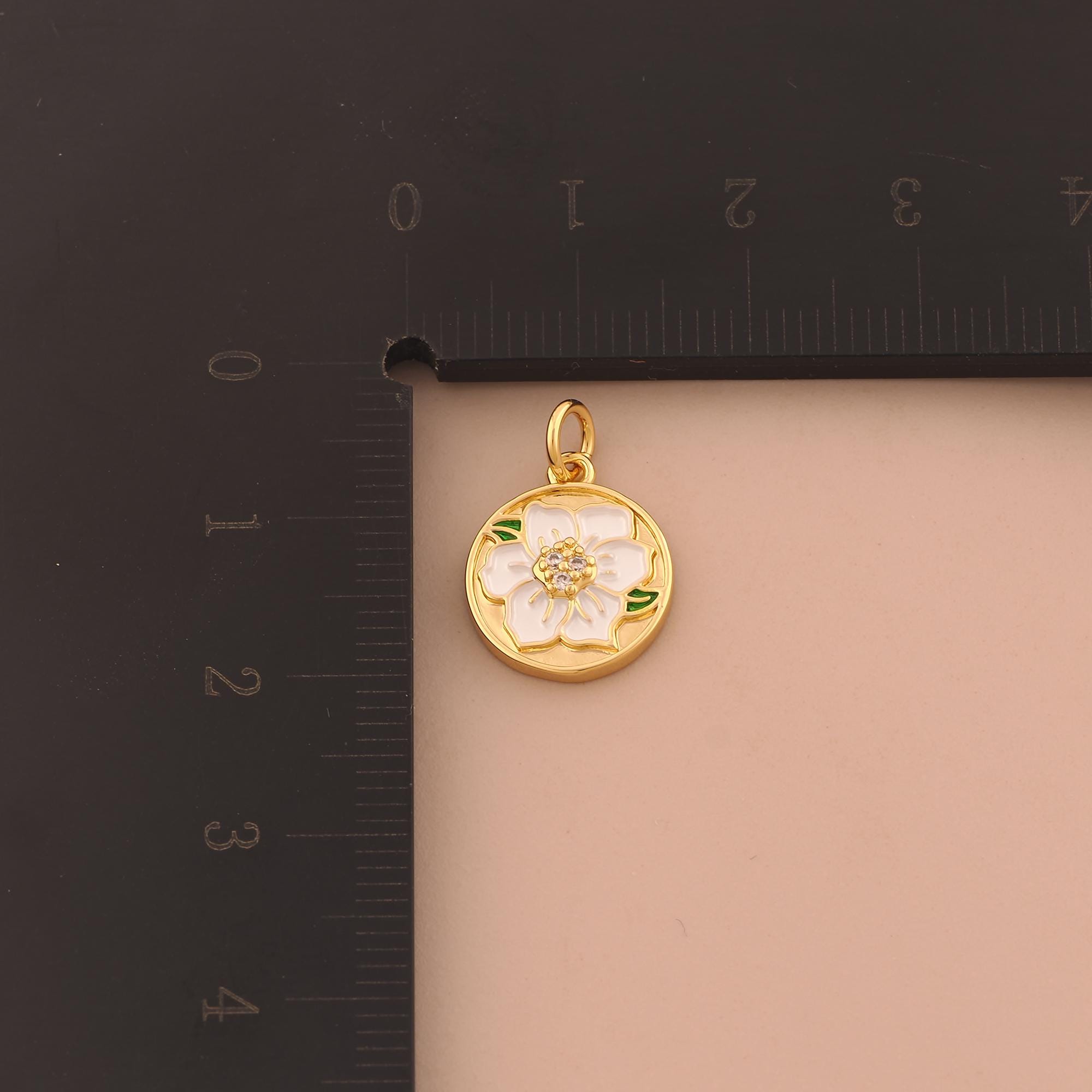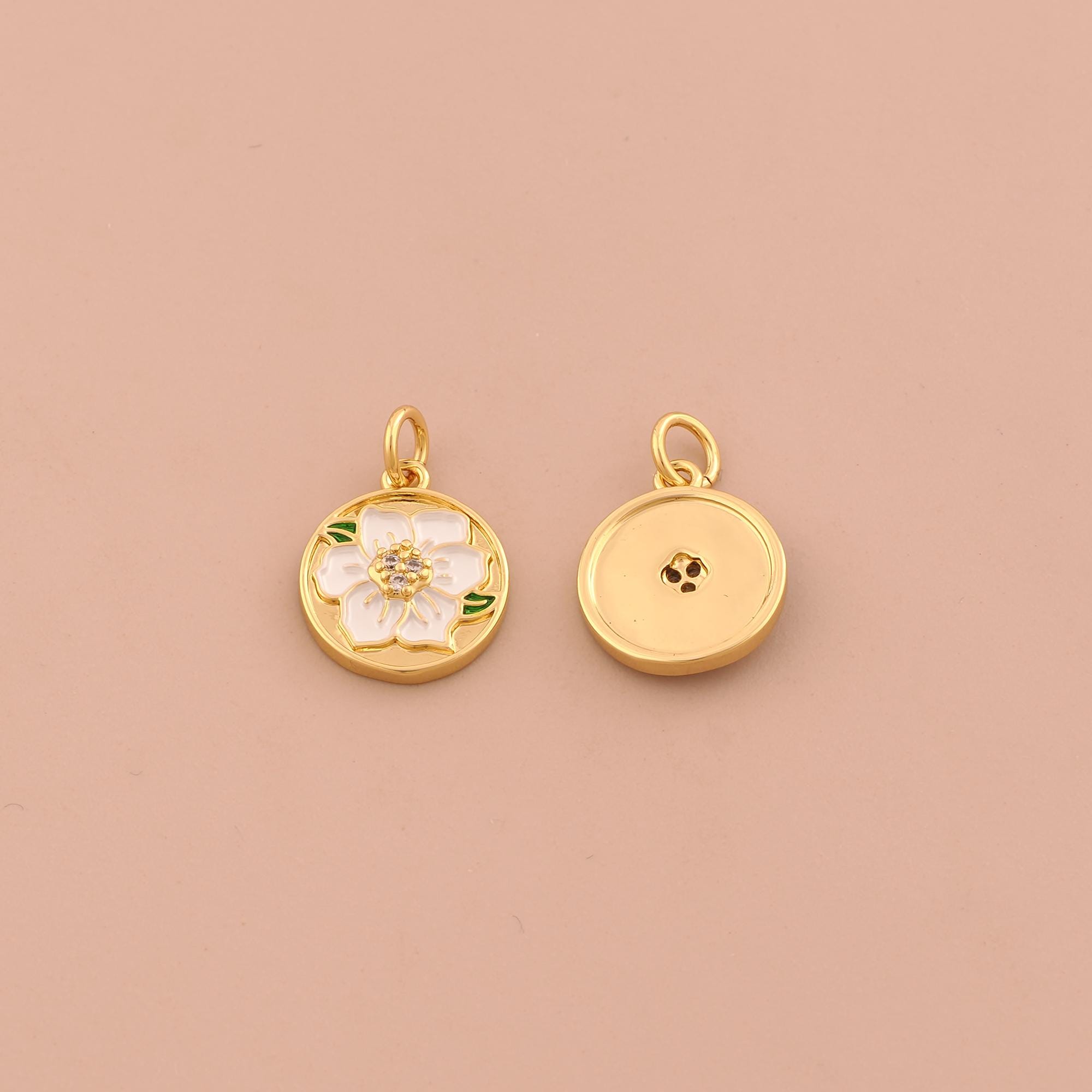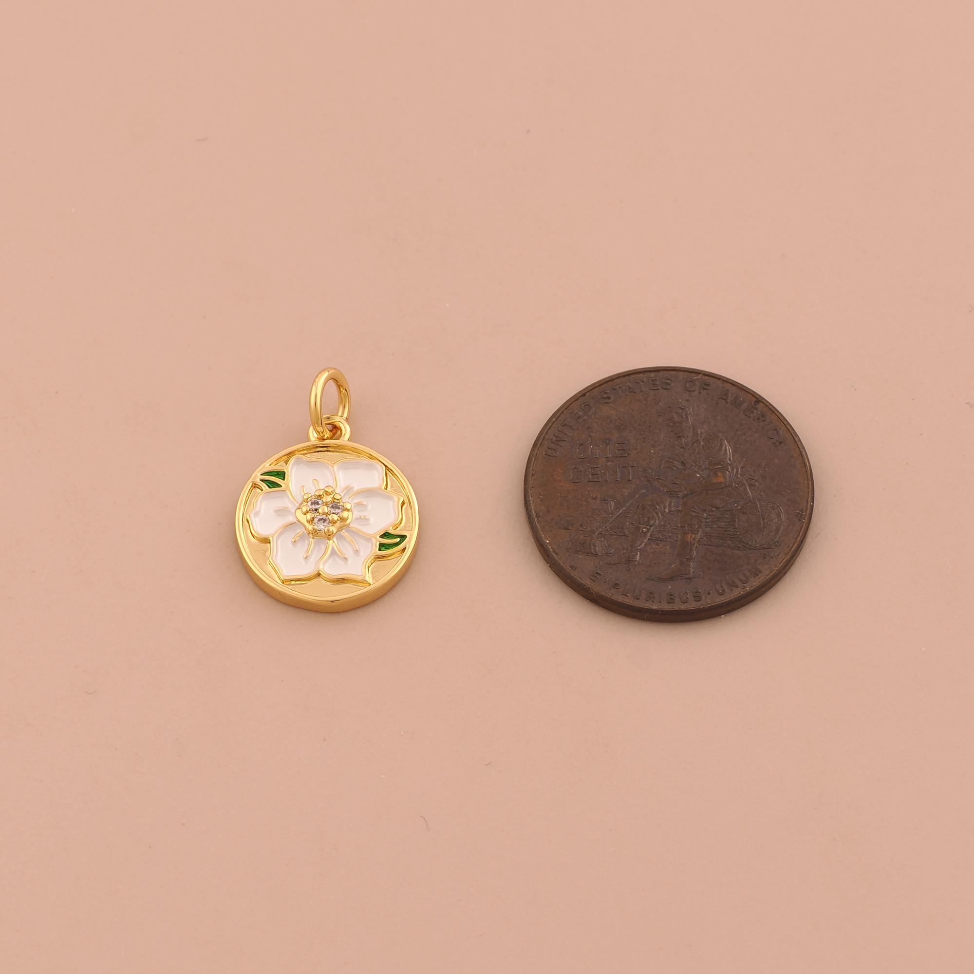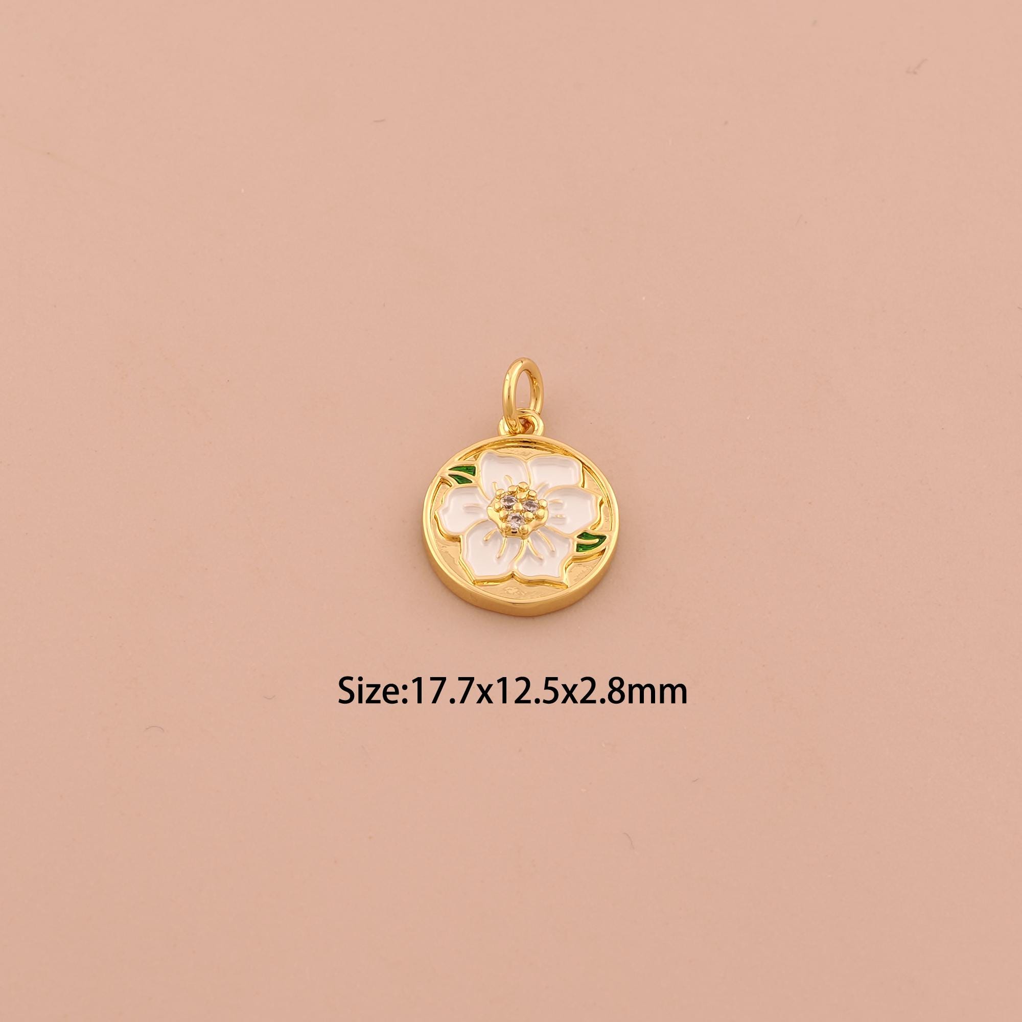 18K Gold Cherry Blossom Charms,Enamel Flower Charms Pendants,CZ Pave Round Charm for DIY Jewelry Making Supply
